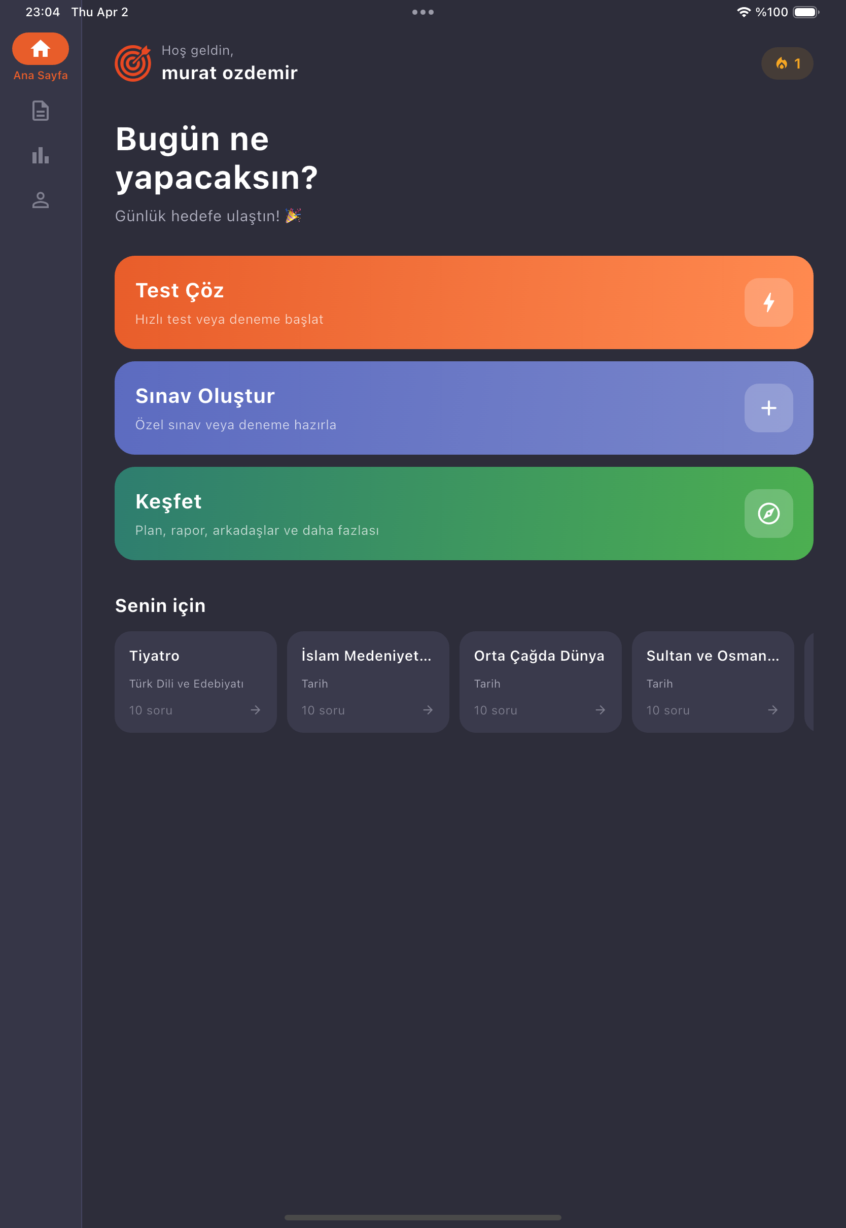 Günlük hedefin, streak'in ve kişisel önerilerini tek bakışta gör. Hızlı test başlat veya devam eden sınavına dön.