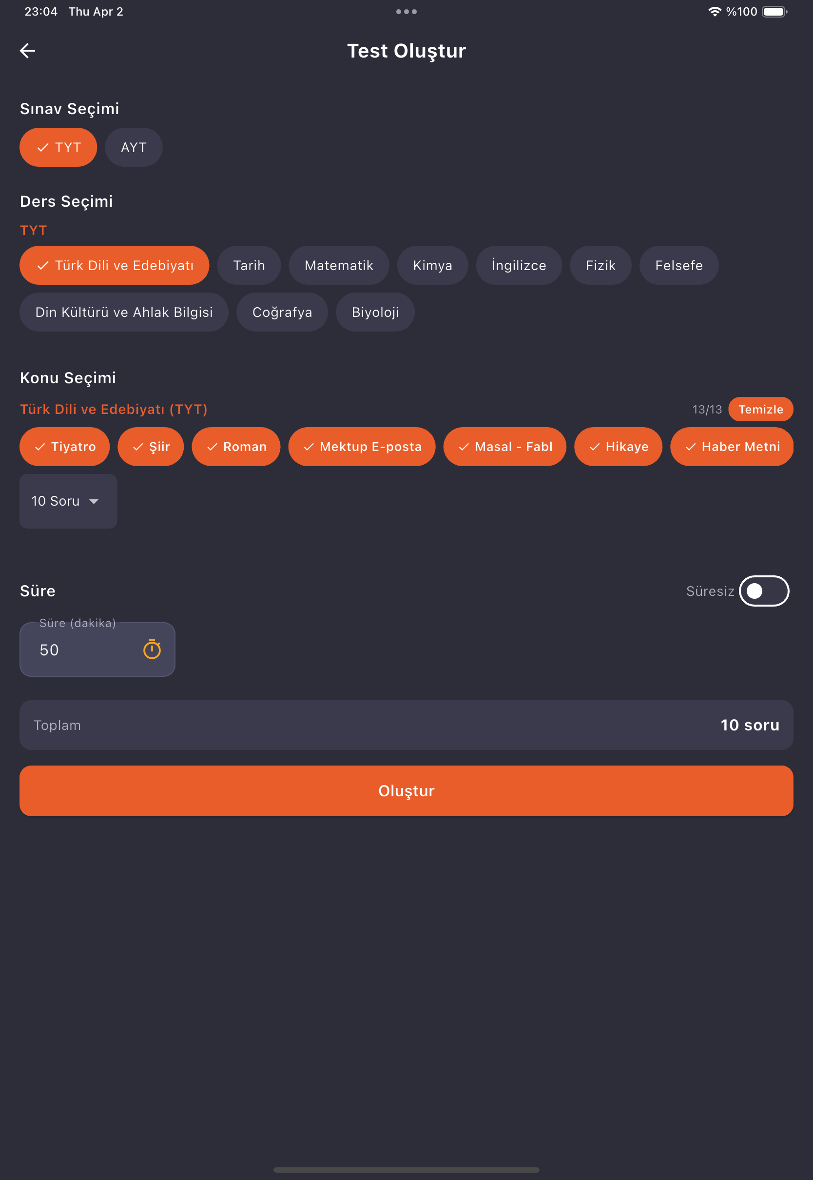 Sınav tipi, ders ve konu seç, soru sayısını belirle. Konulara adil dağılım, çözülen sorular gelmez.